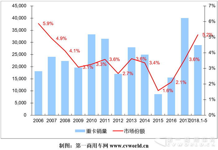 上汽紅巖近十三年來銷量及份額走勢(shì)圖