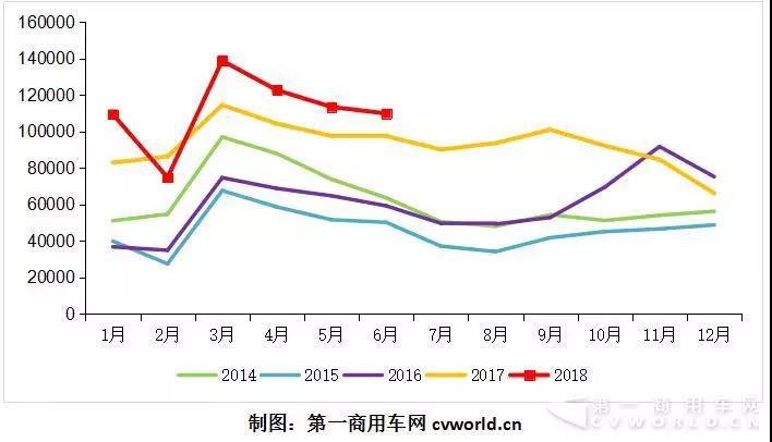 2014-2018年上半年重卡市場月度走勢圖