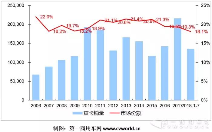 東風(fēng)重卡近年來銷量及份額走勢圖