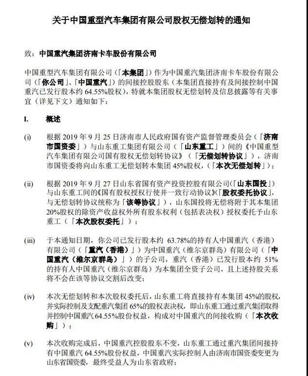 根據(jù)9月30日相關(guān)公告,山東重工集團(tuán)有限公司(以下簡稱山東重工集團(tuán))通過無償劃轉(zhuǎn)方式取得濟(jì)南市國資委持有的中國重型汽車集團(tuán)有限公司(以下簡稱中國重汽集團(tuán))45%股權(quán),并通過股權(quán)授權(quán)委托方式行使山東省國有資產(chǎn)投資控股有限公司持有中國重汽集團(tuán)20%股權(quán)除資產(chǎn)收益權(quán)外的其他股東權(quán)利,山東重工集團(tuán)成為中國重汽集團(tuán)的控股股東。