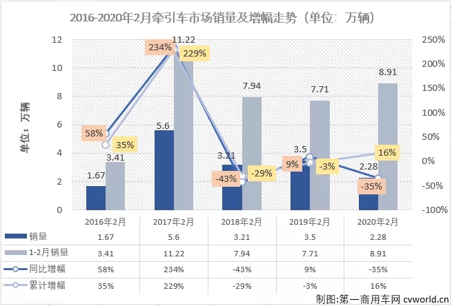 縱觀近五年2月份牽引車市場銷量及增幅走勢圖,牽引車市場的谷底在2016年。2016年,牽引車市場開始復(fù)蘇,2016年2月牽引車銷量同比增長58%,前兩個月銷量則同比增長了35%;2017年,牽引車市場更是增速驚人,2017年2月及2017年1-2月的增幅均超過200%。2018年,牽引車市場首月即遭遇下滑,2月份繼續(xù)下降,2018年前兩月牽引車市場銷量較上年同期下降29%。進(jìn)入2019年,牽引車市場也是首月遭遇下滑,2月份市場實(shí)現(xiàn)轉(zhuǎn)正,從此,牽引車市場開啟了連續(xù)增長模式,截止到2020年1月已經(jīng)連續(xù)12個月實(shí)現(xiàn)增長,成為重卡市場甚至整個卡車市場上最亮眼的存在,但其連續(xù)增長的紀(jì)錄最終停留在12個月。上圖顯示,雖經(jīng)歷了“全市場大降”,但牽引車2020年2月份2.28萬輛的銷量并未跌到近五年最低,1-2月的累計銷量甚至排得上前2并且仍處于上升區(qū)間。