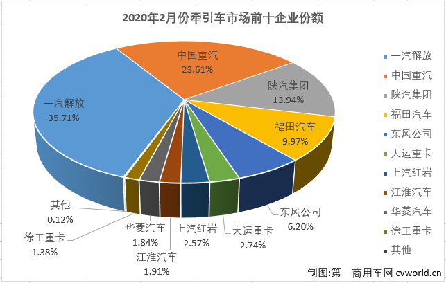 從行業(yè)占有率情況來看,銷量前十企業(yè)2月份合計份額達(dá)到99.88%,十名開外的企業(yè)僅分得0.12%的份額。2月份銷量排名前五的企業(yè)合計份額就達(dá)到89.43%,接近9成,其中排名首位的一汽解放一家就獨(dú)占35.71%,獨(dú)食了2月份牽引車市場超1/3的份額。一汽解放在牽引車市場的霸主地位較其在重卡市場更甚。