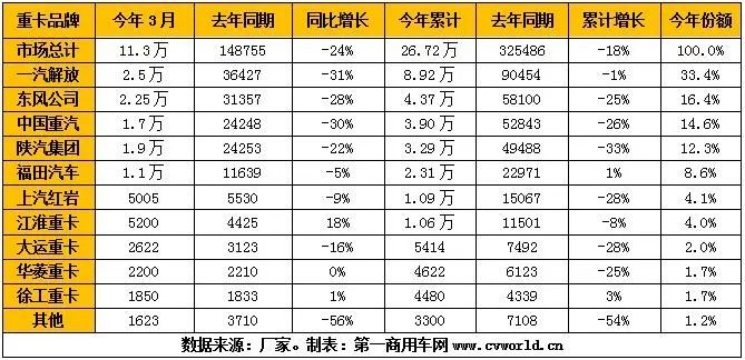 3月重卡銷11.3萬(wàn)輛降超2成