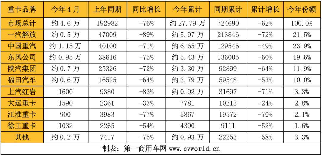行業(yè)資訊今年3月份,傳統(tǒng)的“銷(xiāo)售旺季”變成了淡季,銷(xiāo)量跌到了8萬(wàn)輛以下;4月份的重卡市場(chǎng),再次刷新了“底線(xiàn)”,月銷(xiāo)量還不到5萬(wàn)輛。