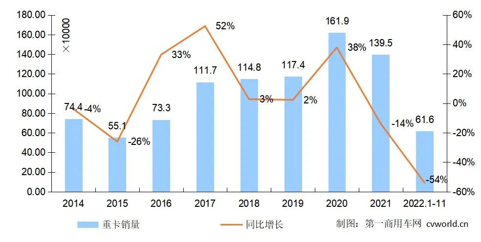 累計(jì)來看,今年1-11月的重卡市場(chǎng)累計(jì)銷售61.6萬輛,比上年同期的133.8萬輛下降54%,減少了72萬輛之多。今年年中的時(shí)候,行業(yè)普遍預(yù)測(cè)下半年市場(chǎng)會(huì)環(huán)比有所回暖,全年銷量預(yù)計(jì)下降40-50%,但現(xiàn)在來看,市場(chǎng)銷量“腰斬”都不止,同比下降超過51%幾成定局。而且,如果不是新能源重卡以及中國重卡海外出口持續(xù)給力,同比繼續(xù)大幅增長(zhǎng)的話,2022年的重卡市場(chǎng)整體降幅會(huì)更大。