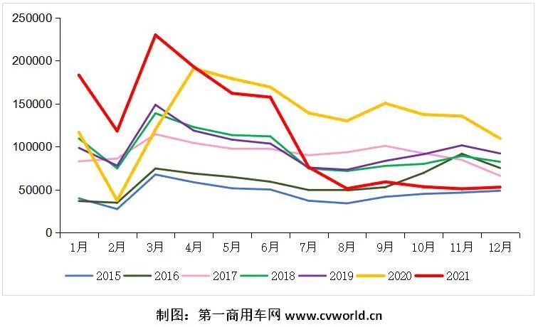 12月份過后,重卡市場已經(jīng)連續(xù)五個月(8-12月)同比降幅超過50%。如“2015-2021年我國重卡市場銷量月度走勢圖”所示,代表2021年的紅色曲線,1月份直至4月都居于最上端;從5月份開始,銷量出現(xiàn)首次下滑,代表2021年的紅色曲線掉到了代表2020年的黃色曲線下方,市場連續(xù)兩個月呈現(xiàn)出不到10%的溫和下滑;三季度和四季度,重卡行業(yè)需求及訂單快速“惡化”,市場月度走勢呈現(xiàn)出陡峭的下降曲線:7月份銷量同比大幅下滑45.2%;8月份銷量同比下降60.5%;9月份,“金九”變成了“銅九”,月銷量不到6萬輛,同比下滑60.7%;10月份,重卡市場銷量同比下降61.1%;11月份,重卡市場整體銷量只有5.11萬輛,比上年同期的13.56萬輛下降了62.3%,月銷量創(chuàng)下2021年內(nèi)最低;12月份,市場銷量雖然同比降幅收窄了10個百分點(diǎn),但終端需求情況未見好轉(zhuǎn)。